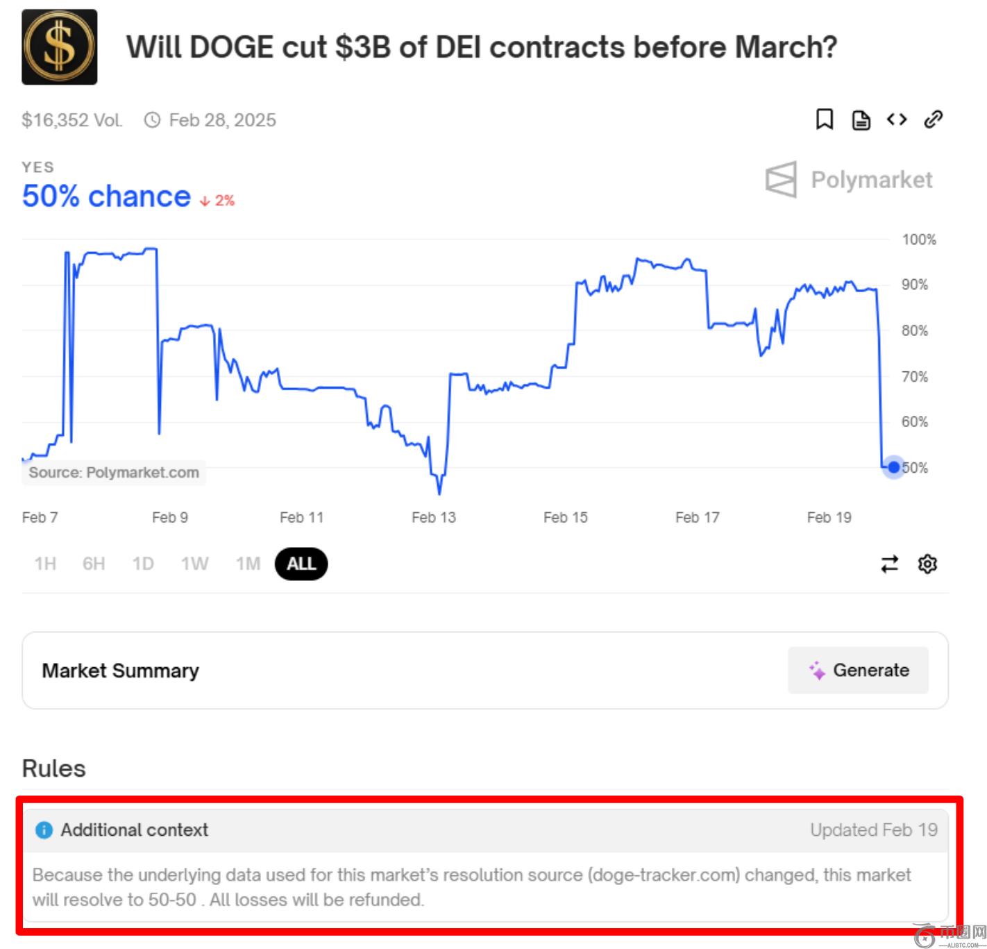 Polymarket说:“因为用于该市场的分辨率来源(Doge-tracker.com)使用的基础数据更改了,”它取消了下注。它退还了所有损失,并以50-50的结果解决了市场。