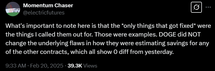 Doge已经有纠正这些错误。但是,X上的@ElectricFutures说,尽管纠正了这些错误,但Doge“并没有改变他们如何估算其他**合同的节省的潜在缺陷”。