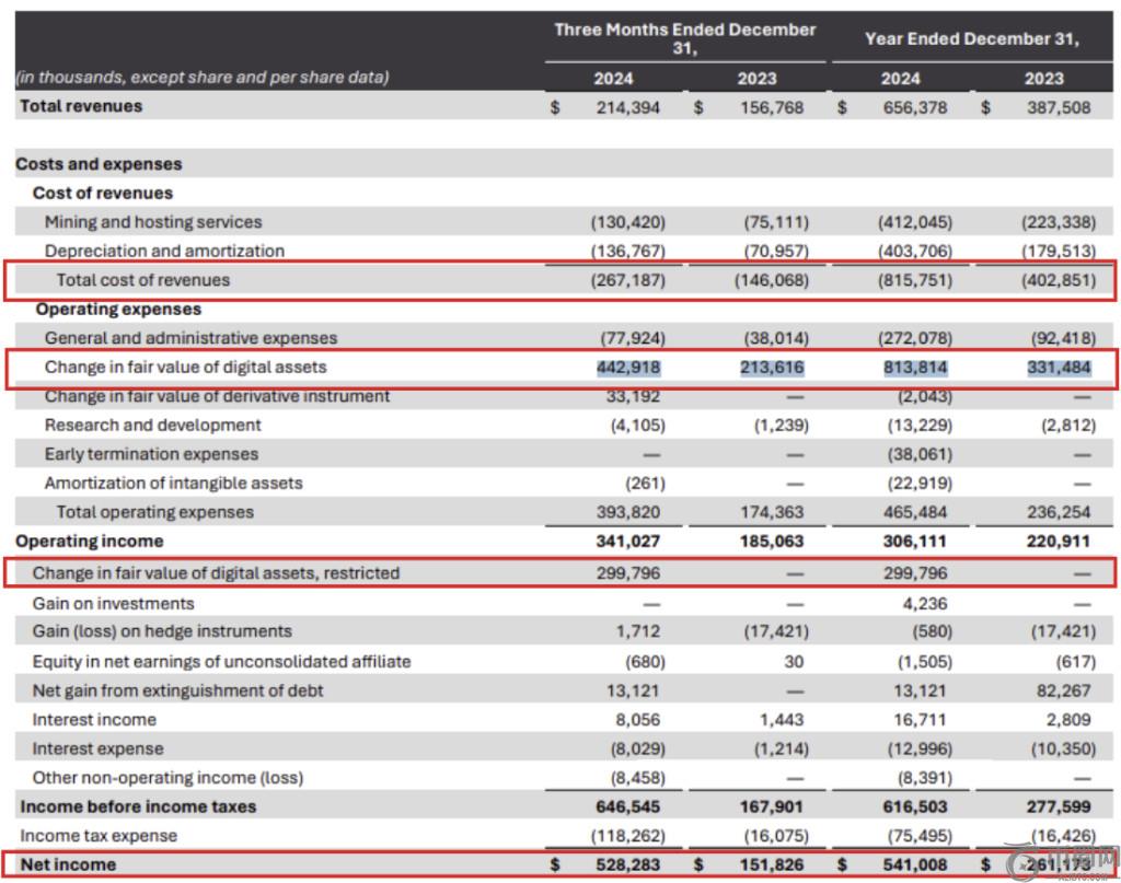 不过,细看其财务报表,在2024年第四季度,公司的净利显著增加,主要原因之一就是数字资产的公允价值变动。根据报告,公司在第四季度的数字资产(包括比特币应收款)的公允价值收入为7.4亿美元。