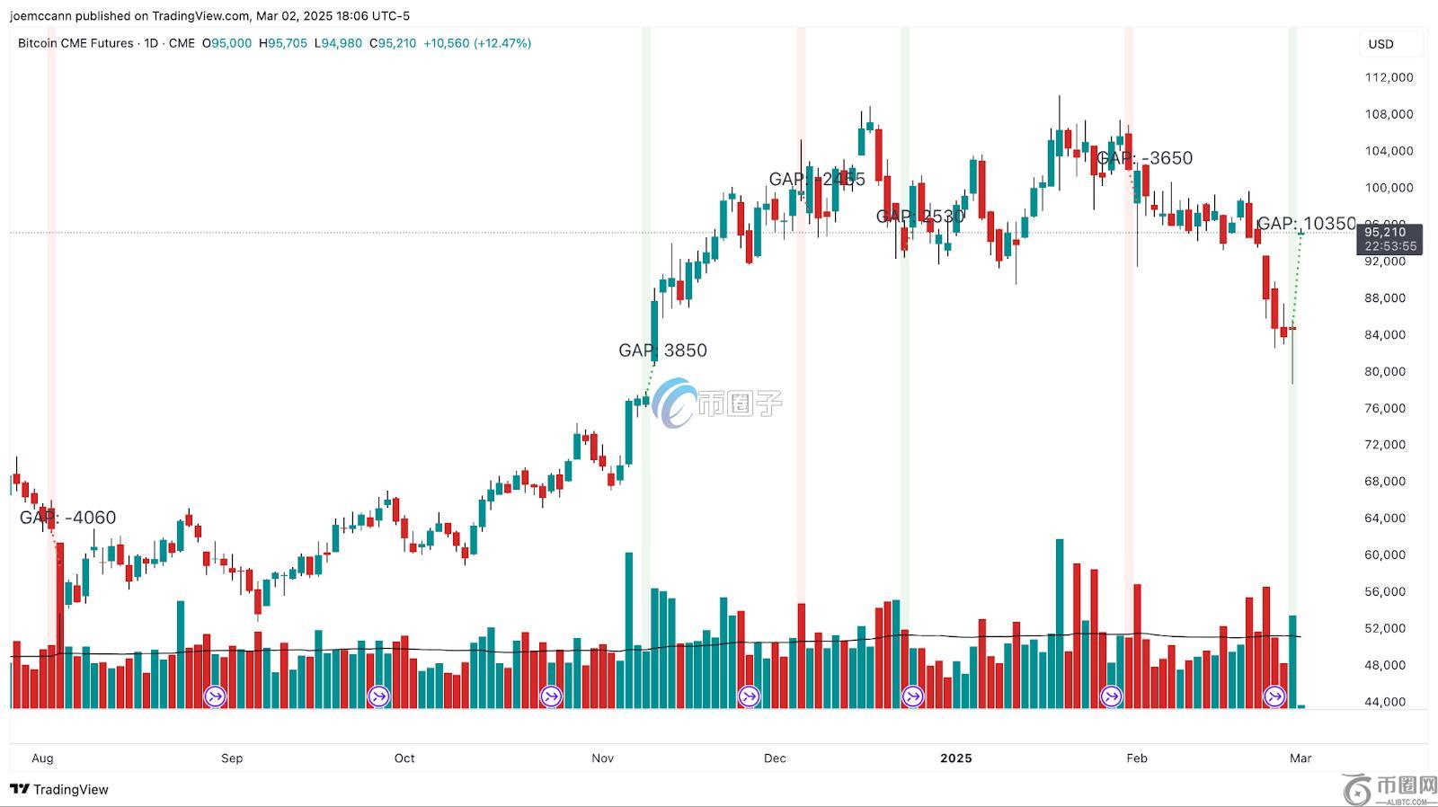 根据TradingView数据,**宣布后,现货市场瞬间涌入超过3,000亿美元,推动比特币价格在几小时内从85,000美元飙升至接近95,000美元,并造成CME期货出现10,000美元的巨大缺口。这一纪录大幅超越了2024年8月的4,000美元先前**纪录。