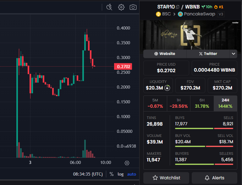 STAR10表现为通常的模因令牌,以低价价格推出,上升到0.38美元。后来,资产再次下跌至0.27美元。在交易的前10个小时,令牌的泳池锁定了超过2000万美元的流动性。该令牌已经登上了9,335个买家,其中大多数直接通过Pancakeswap配对。