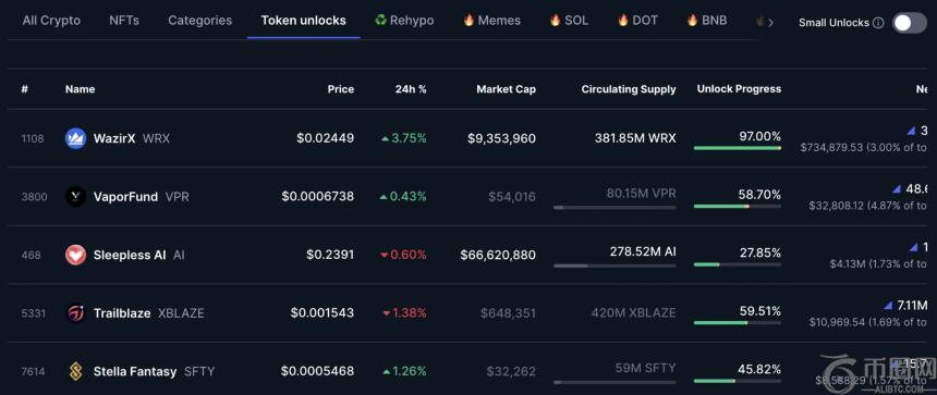 较小规模的解锁包括Filecoin(FIL,884万美元)、BERA(807万美元)、ENS(711万美元)和SEI(704万美元)。CoinMarketCap数据显示,不同项目的市场价格表现各异。WazirX(WRX)和Vaporfund(VPR)在过去24小时内均录得0.08%的小幅上涨,而不眠AI(AI)下跌了0.18%。Trailblize(Xblaze)下跌1.13%,但Stella Fantasy(SFTY)上涨了1.25%。