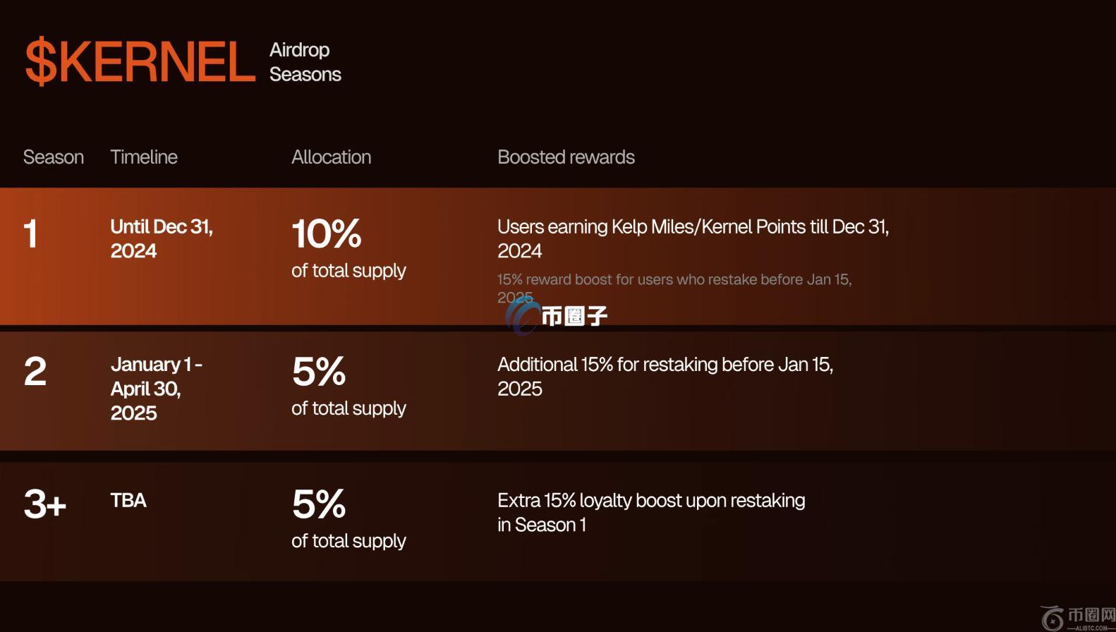 **季(~2024/12/31)已结束:2024年12月31日前获得Kelp Miles/Kernel Points的用户(2025年1月15日前重新质押,可获得第二季15%的奖励加成),分配总供应量10%**。