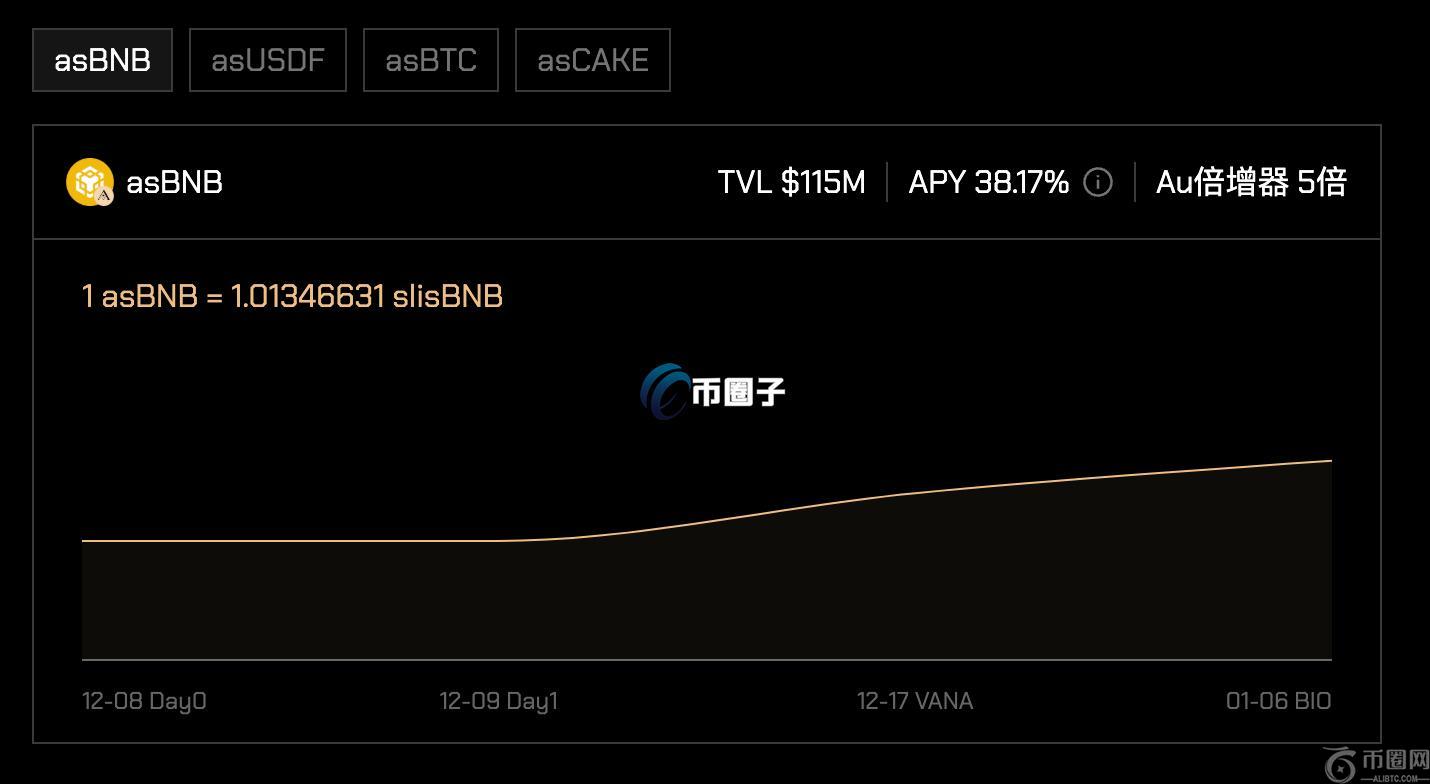 asBNB是由多资产流动性**协议Astherus铸造,与其他协议不同的是,asBNB持有者能够领取币安Hodler、Megadrop和Launchpool等奖励。截至目前,asBNB的APY为38.17%(APY包含币安Hodler等奖励)