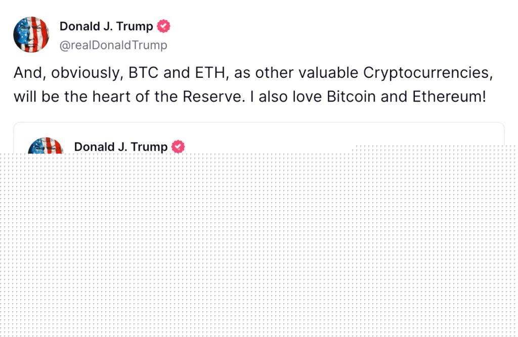 一个半小时后,特朗普有补充表示,比特币和以以太坊也将成为储备核心:显然,BTC、ETH和其他有价值的加密货币一样,将成为储备的核心。我也喜欢比特币和以太坊!