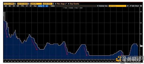 这是联邦基金利率下限的图表。每个红色箭头代表与经济衰退同时发生的宽松周期的开始。如你所见,很明显,美联储至少会在经济衰退期间降息。
