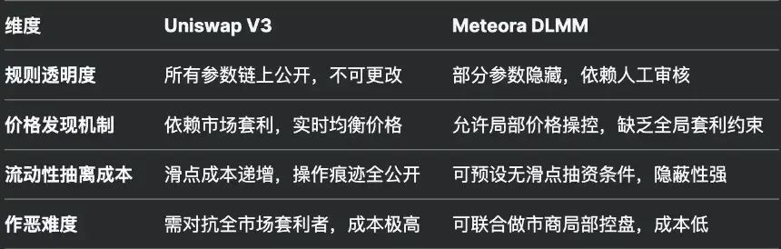 Uniswap V3 的流动性规则由数学公式强制执行,所有参数「费用、价格区间」公开透明且无法事后篡改。因此即使存在单边流动性,链上的套利者也能通过链上数据实时监控并进行套利而平衡市场,这对预期通过部分价格区间控盘的项目方是沉没成本极高的方式。而对于 DLMM,项目方需通过 Meteora 团队的帮助才能创建定制化流动性池,这一过程存在相当主观的判断「仅 Meteora 可以判断该项目方的可靠性」和信息不对称。例如 Libra 团队可能以「优化用户体验」为由,要求设置特殊区间内非常规滑点参数或隐藏流动性锁定期,而这些细节往往在短时间内让链上套利者难以执行策略而难以均衡市场价格。