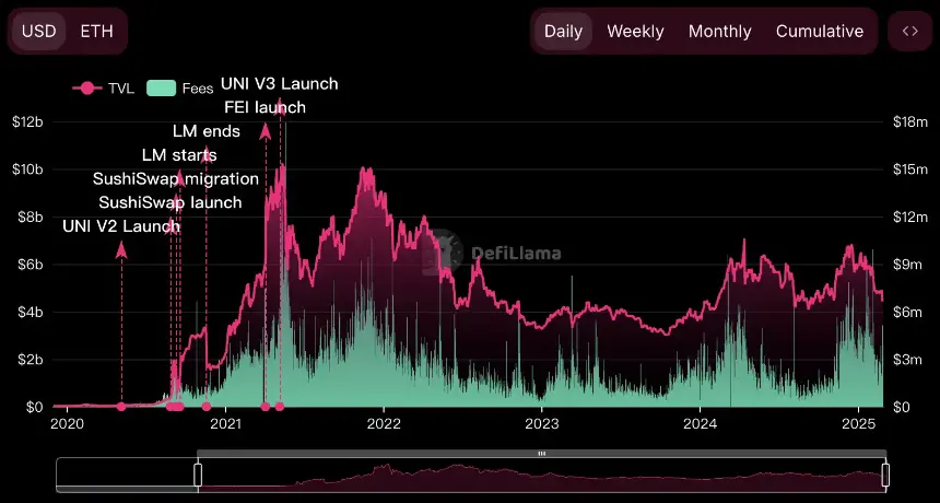 当 Ben 指出 Meteora 的 DLMM 流动池需要人工定制时,市场很自然的将其与 Uniswap V3 的单边池机制对比。时间回到 2018 年 Vitalik 发起的标志性投票——超 80% 用户支持「Uniswap 应自由上币」,由此推动区块链从 ICO 迈向 DeFi 无许可时代。Uniswap 凭借该机制在**期占据超 80% DeFi 市场份额,其「无许可」的底层逻辑至今仍深刻影响着行业 DeFi 标准。