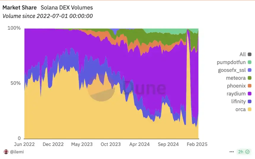 由 Dune 数据来看 Meteora 市占率仅 5%