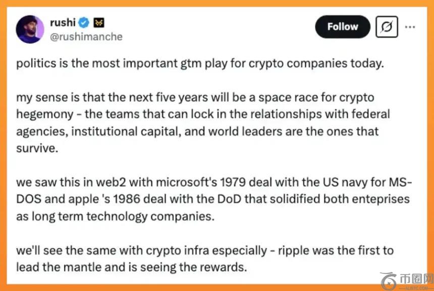正如 Movement 创始人 @rushimanche 所说,「政治是当今加密货币公司最重要的市场进入策略。」他预测,未来五年只有那些与联邦机构、机构资本和世界领导人建立牢固关系的团队才能生存。这一愿景强化了真正的美国本土影响力取决于公司如何有效参与政治和机构权力——美国 CABAL。