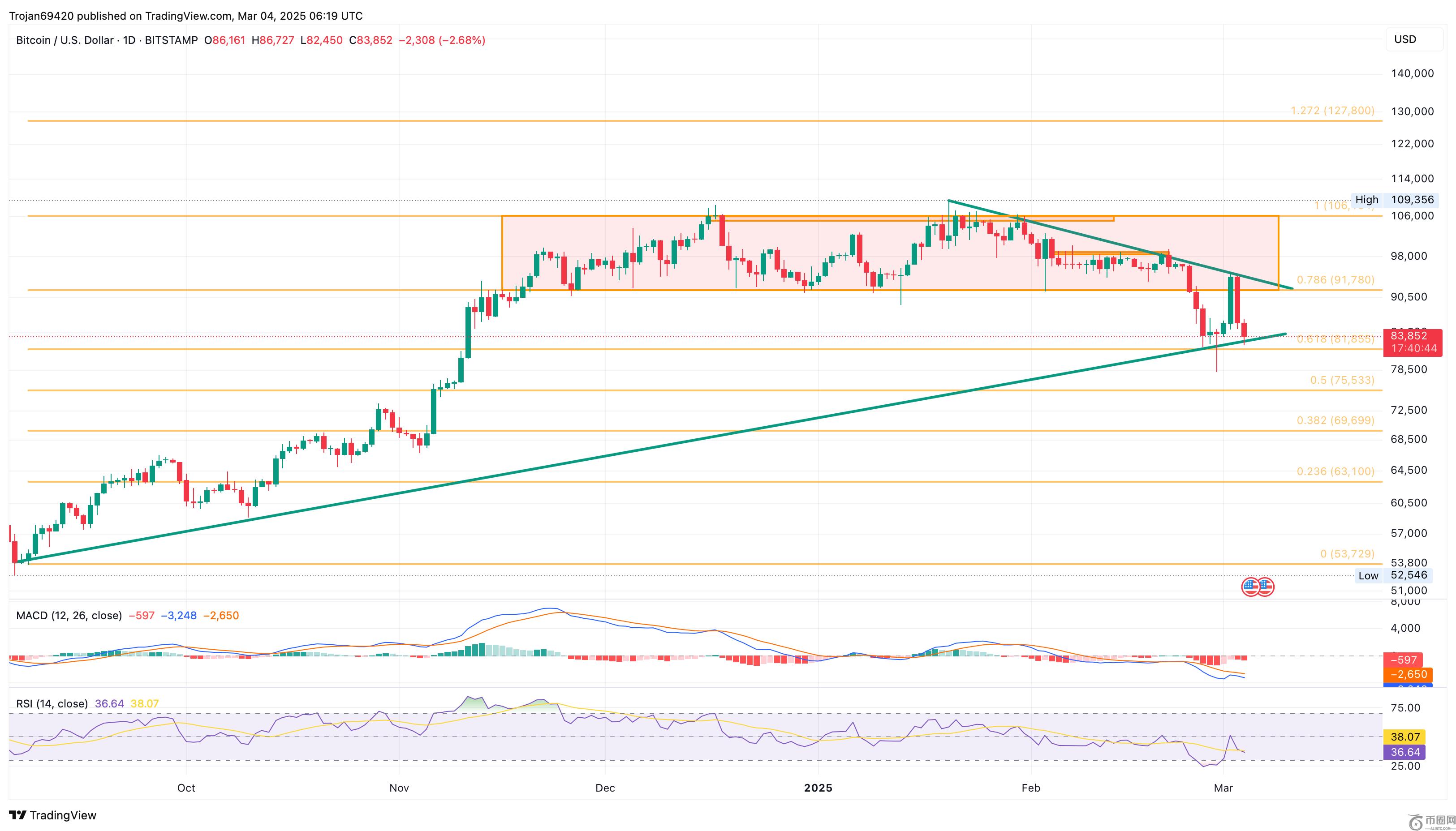 文章标题:比特币重新审视$ 82K:三角辐射会跌至70k美元吗?