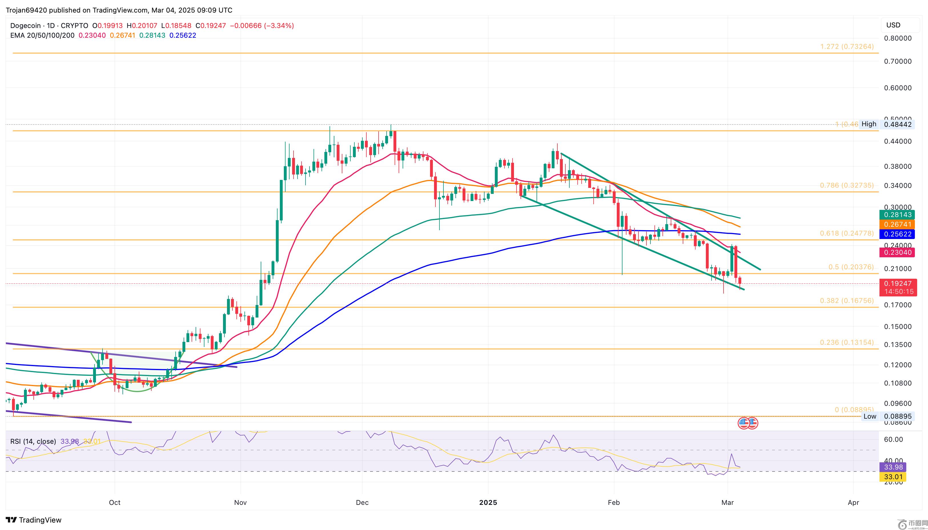 Dogecoin下跌了16.78%,**了周末的恢复,现在的交易价格低于50%的斐波那契水平,为0.20美元。 Dogecoin的24小时低点为0.1854美元,正在测试坡度下降的局部支持趋势线。
