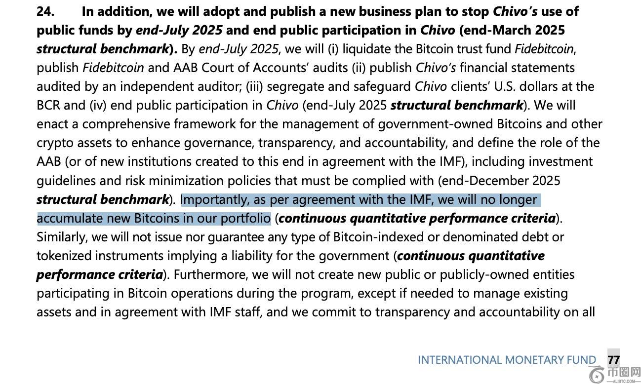 值得注意的是,在**更新中,萨尔瓦多政府承诺在2025年3月之前终止公众参与Chivo Bitcoin项目,并于2025年7月**停止。
