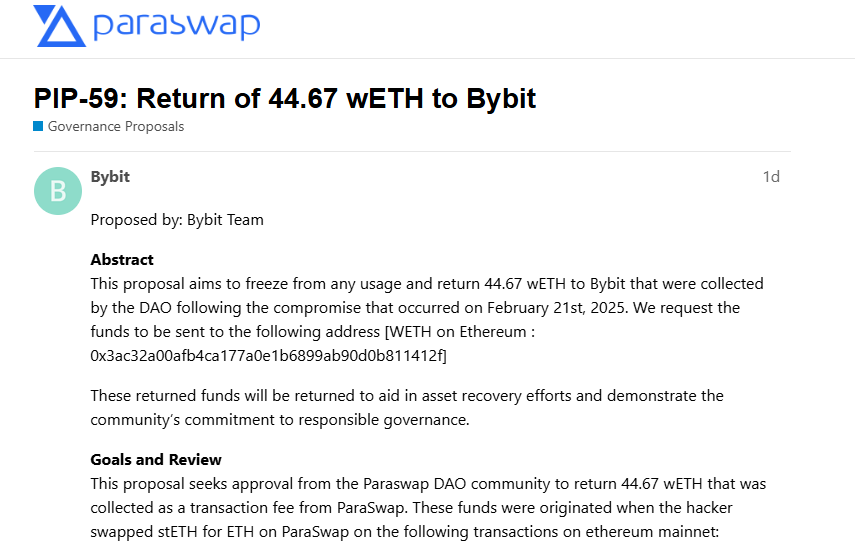 文章标题:Bybit要求从Paraswap Dao获得44.67 ETH,并以Hacker的交换费为