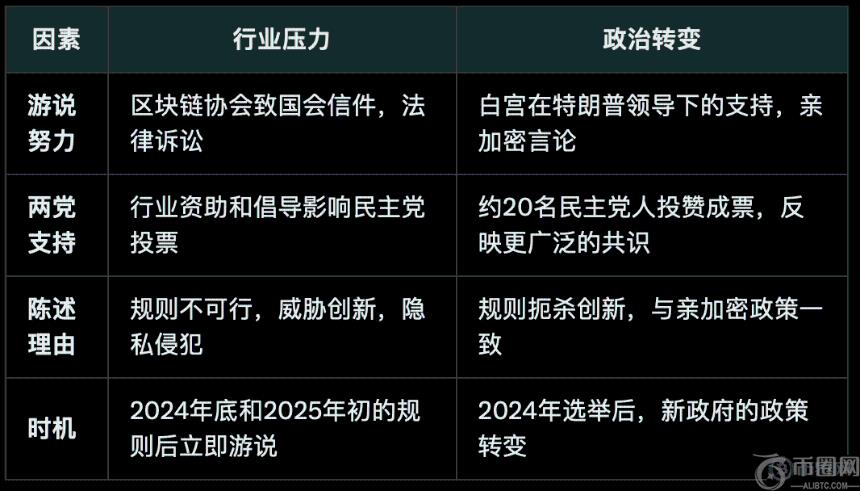 推动投票通过的另一股力量来自行业压力与游说努力。区块链协会代表76家加密公司于2025年2月19日致信国会领导人,包括参议院多数党**John Thune和参议院少数党**Chuck Schumer,敦促废除该规则,称其威胁美国加密创新。行业游说的压力与**政府的支持,为众议院投票通过提供了必要基础。