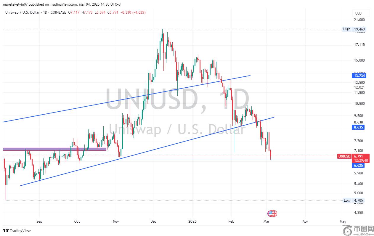 尽管卖方压力压力,但Uni的6.625美元价格水平一直在探测强大的需求区。该区域历史上一直是可靠的支持,通常迫使几种逆转。