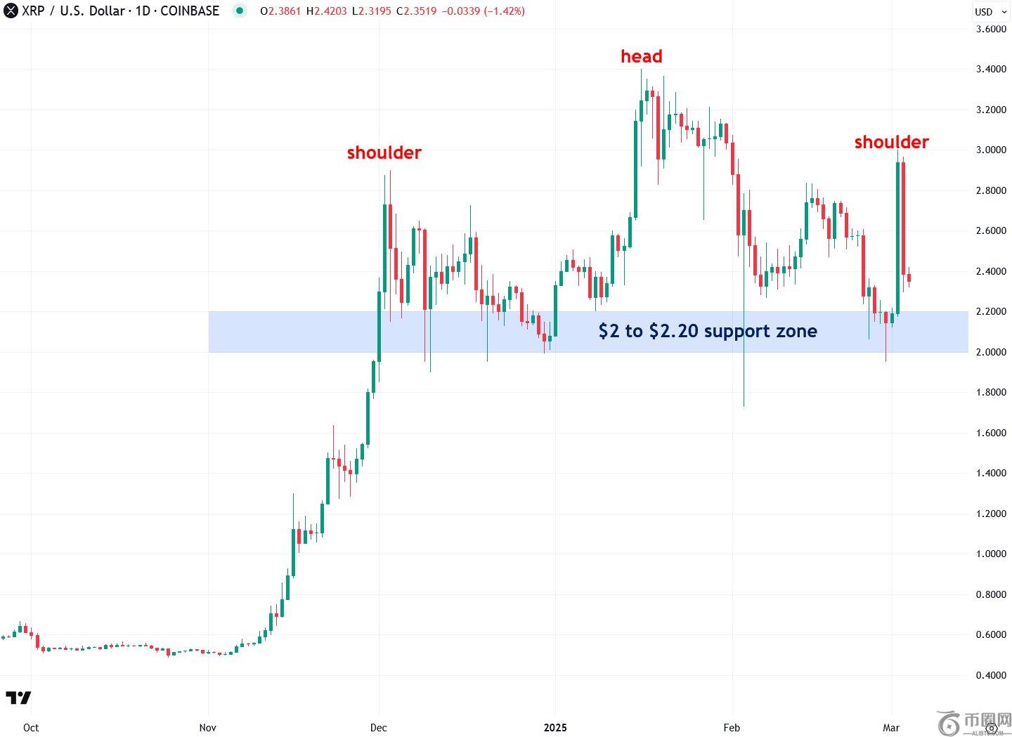 该图表显示出头部和肩膀的结构,领口在$ 2到$ 2.20范围内。科伦坡强调,低于2美元的决定性关闭将确认这种模式,并可能引发急剧的抛售,可能会使XRP急剧下降。