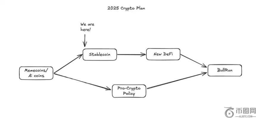 编者按:本文讨论了 2025 年加密货币市场可能的走向,特别是在创新缺乏的情况下,稳定币市场需求可能会增加。作者认为如果市场继续看跌,收益生成型稳定币产品可能占据稳定币市场的 20-30% 。随着稳定币市场的增长,更多的开发者和新的 DeFi 创新可能会涌现。此外,特朗普支持加密货币的政策有助于美国本土加密产业的发展,投资者应关注美国本土加密**的潜力。