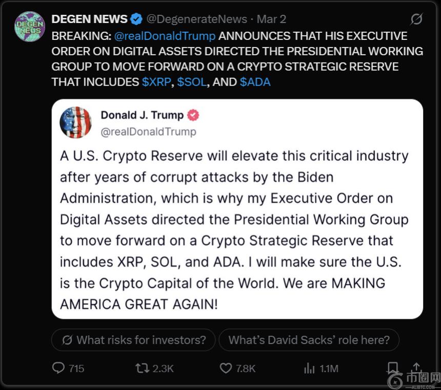 尽管关于加密货币储备是否会获得政府批准仍然存在不确定性,但特朗普对加密货币市场的影响不可忽视。