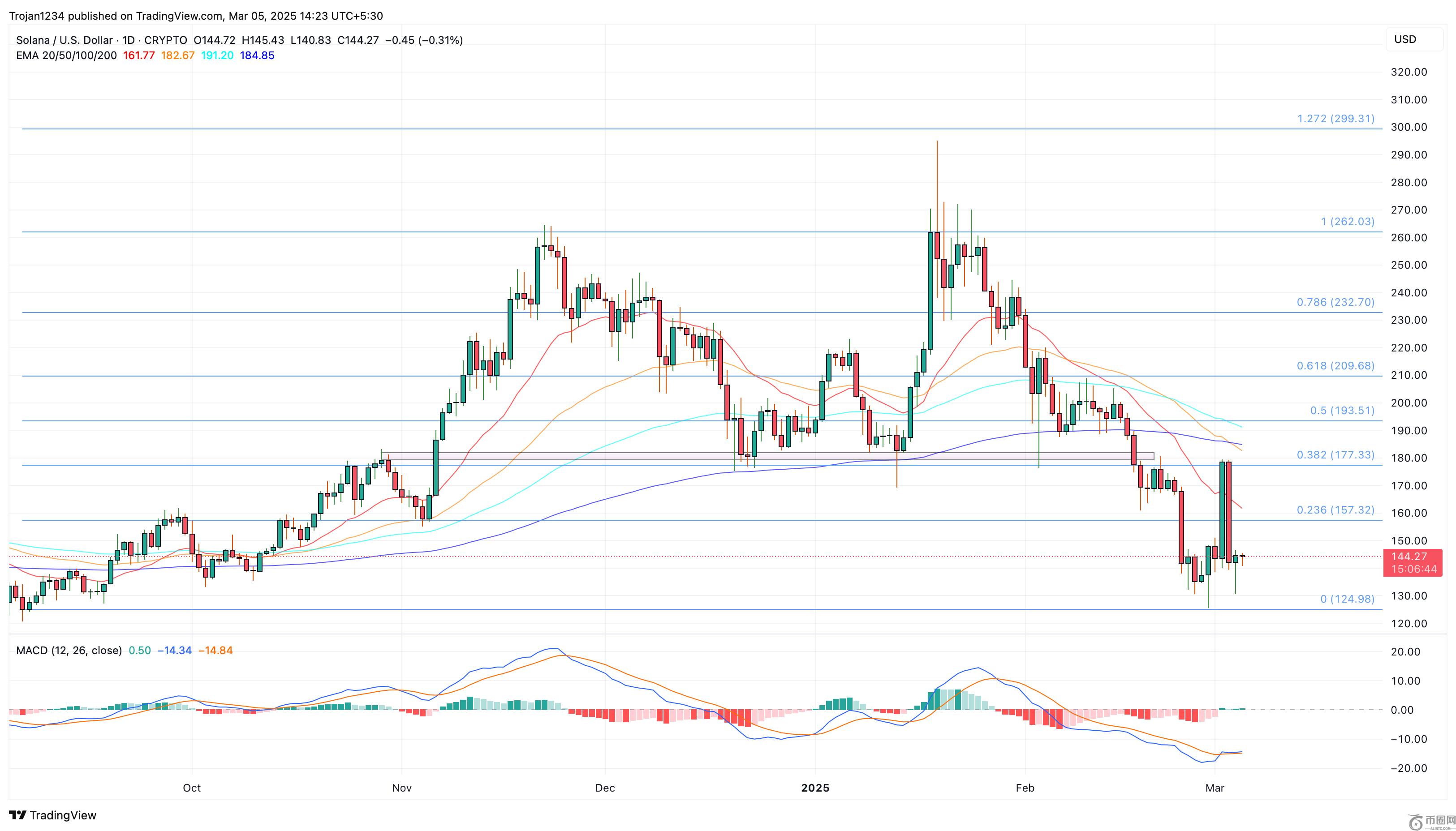 On the daily chart, the SOL price trend shows a lower price rejection on March 4, with a 24-hour low at $130. Buyers managed to push the SOL token price higher, resulting in a 1.18% recovery by the end of the day.