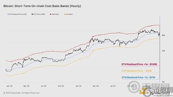 历史上,短期持有者成本基础一直是牛市上升趋势中的重要参考水平。我们计算了短期持有者成本基础的 ±1σ 区间,这通常作为局部价格行为的上限和下限。