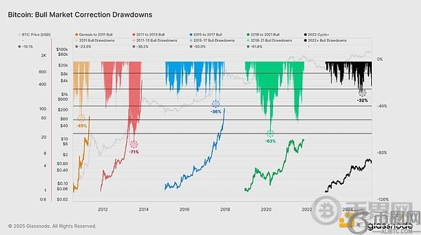尽管此次调整力度很大,但下跌幅度仍与本周期之前的下跌幅度一致,比特币交易价格比其历史高点低 28%。这凸显了比特币在 2023-25 年上涨趋势中相对强劲的需求状况,与之前的周期相比,这一趋势的特点是下跌幅度较小。
