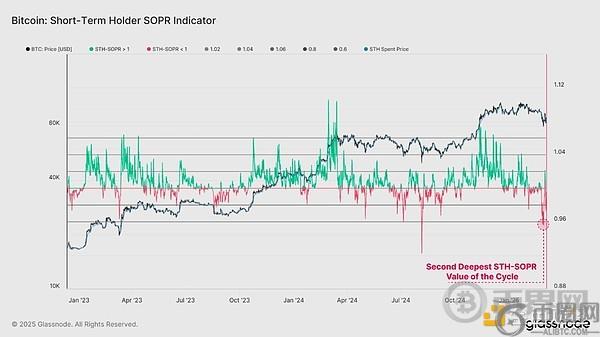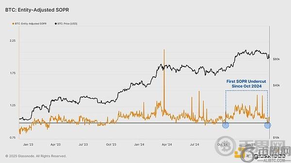 从 SOPR 指标(评估投资者锁定的平均盈利/亏损倍数)的角度来看,我们注意到这是自 2024 年 10 月以来**亏损主导时期。