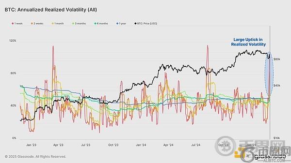 我们可以看到,比特币的实际波动性在几个时间段内激增。从这个角度来看,1 周和 2 周**窗口记录了迄今为止周期内**的波动性值,超过了 80%。