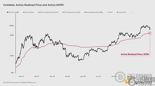 活跃实现价格交易价格为 70,000 美元,与 STH-CB 下限以及 URPD 指标中先前讨论的空气间隙下限一致。由于几个关键成本基础指标之间存在显著的汇合,该价格区域成为一个值得关注的领域,或许是多头在**抛售的情况下的**一道防线。