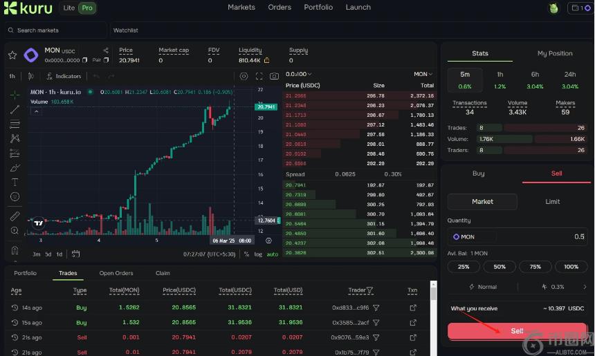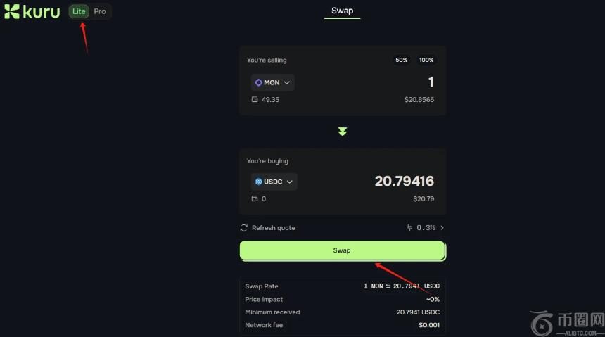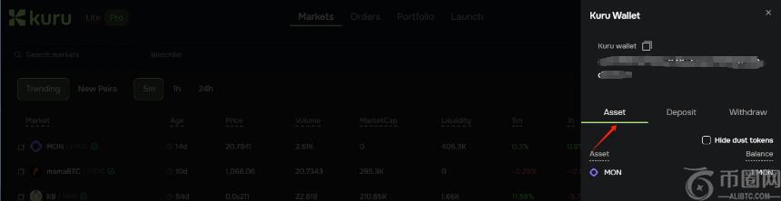 交互内容(链接:https://www.kuru.io/markets):先将测试币转到平台中个人的 Kuru Wallet 中,进行买卖**交互。此外,在 Lite 版中还可以进行 Swap 交互,将 MON 测试币兑换成 USDT、USDC 等**。