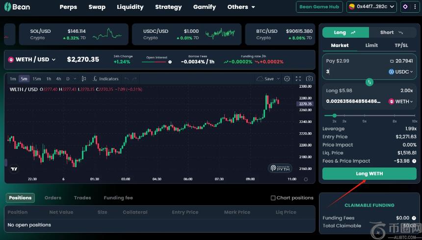 交互内容(链接:https://perp.bean.exchange/#/trade):进行合约操作交互体验。此外也可以进行 Swap 操作增加交互记录。