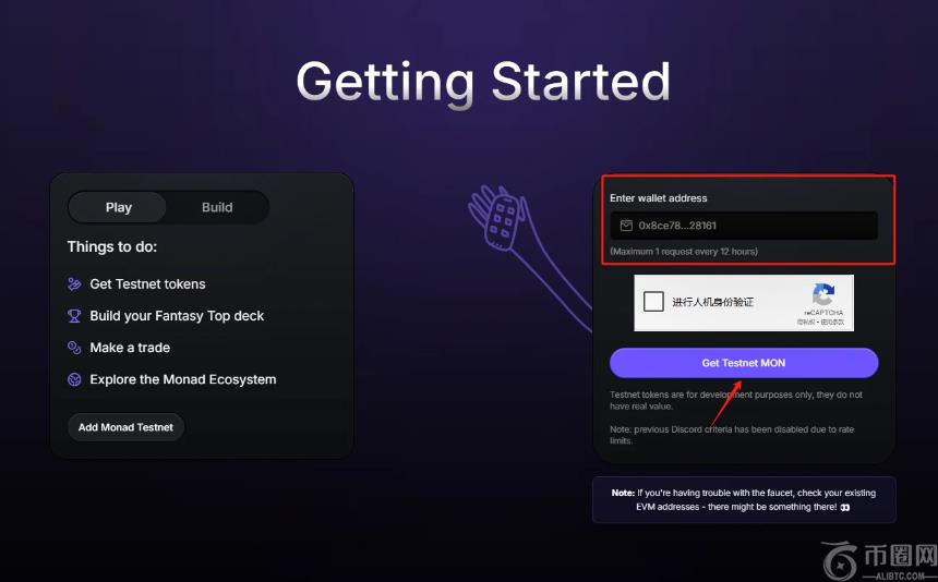 渠道一:官方领取(链接:https://testnet.monad.xyz/)。输入钱包地址并进行人机认证后点击“Get Testnet MON”即可领取,领取**为 12 小时一次。