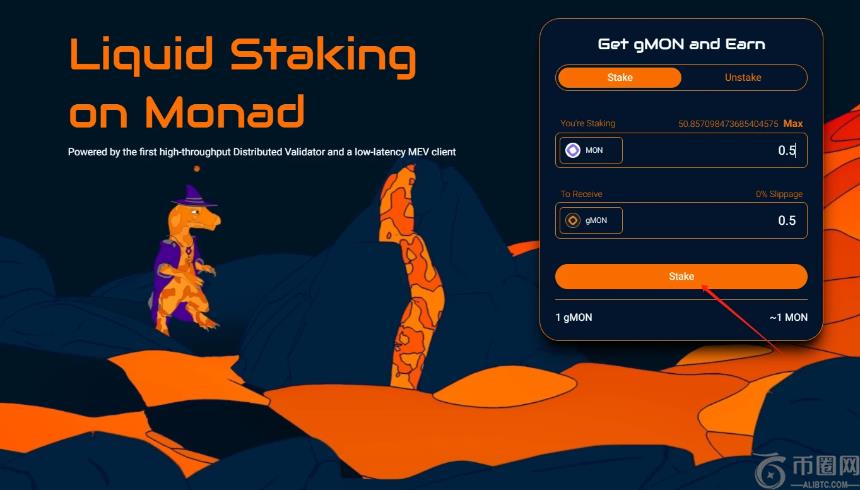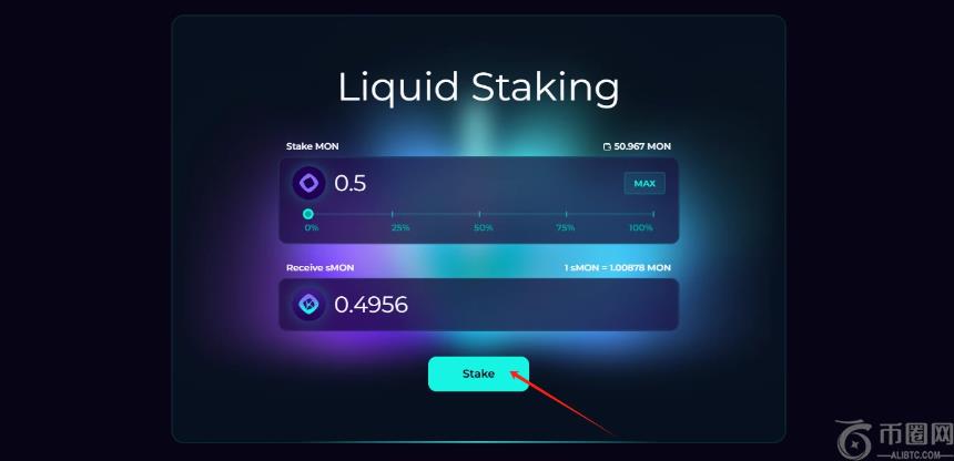 交互内容(链接:https://www.magmastaking.xyz/):点击“Stake”输入测试币数量再点击下方“Stake”即可,也可进行“Unsatke”操作增加交易记录。