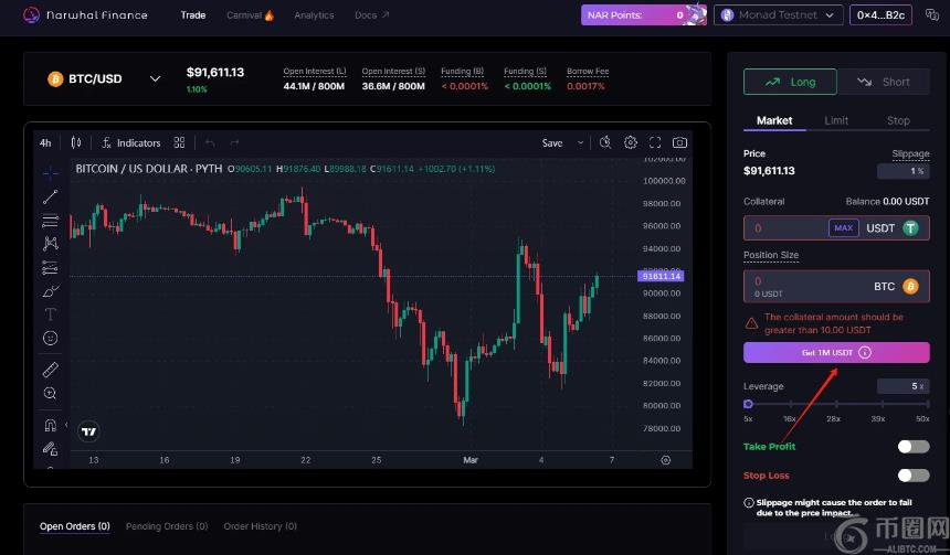 交互内容(链接:https://testnet.narwhal.finance/):领取“ 1 M USDT”后进行合约操作交互体验。