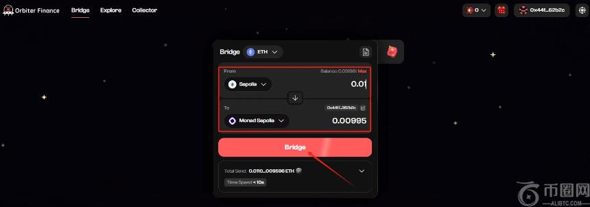 渠道二:从 Sepolia 测试网跨链到 Monad(链接:https://testnet.orbiter.finance/en?src_chain=11155111tgt_chain=10143src_token=ETH)。此方法需要在 Sepolia 测试网有 ETH 资产,选择 Sepolia 与 Monad Sepolia 后点击“Bridege”即可。