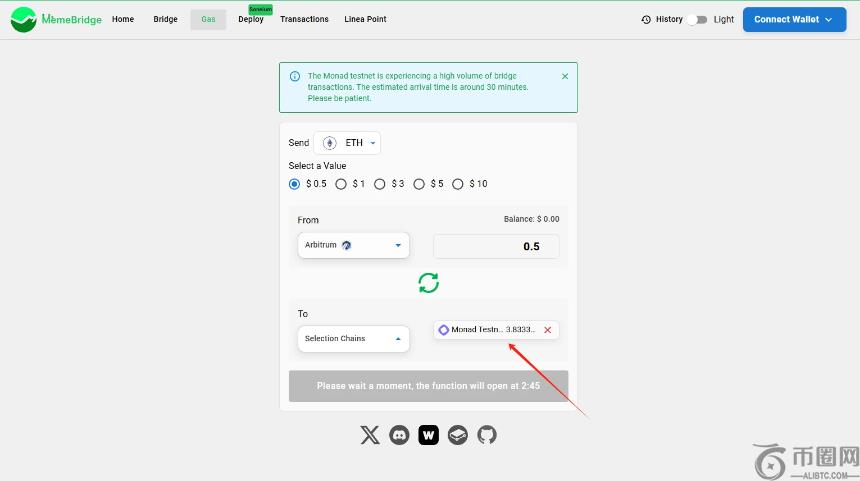 渠道三:主网资产付费购买(链接:https://www.memebridge.xyz/gas),选择 ARB 链(OP 链),目标链选 Monad,点击 Tran**er 即可。