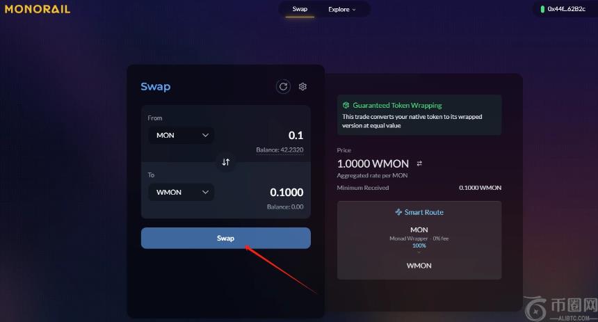 交互内容(链接:https://testnet-preview.monorail.xyz/):将 MON 测试币兑换成 WMON。