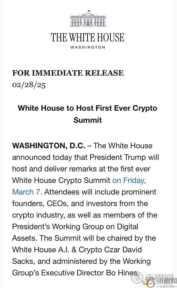 2025年2月28日,白宫宣布,特朗普将于 3 月 7 日星期五主持首届白宫加密货币峰会并发表讲话。与会者将包括加密货币行业的知名创始人、**执行官和投资者,以及总统数字资产工作组的成员。峰会将由白宫 A.l. 和加密货币沙皇 DavidSacks 主持,并由工作组执行董事 Bo Hines 负责管理。