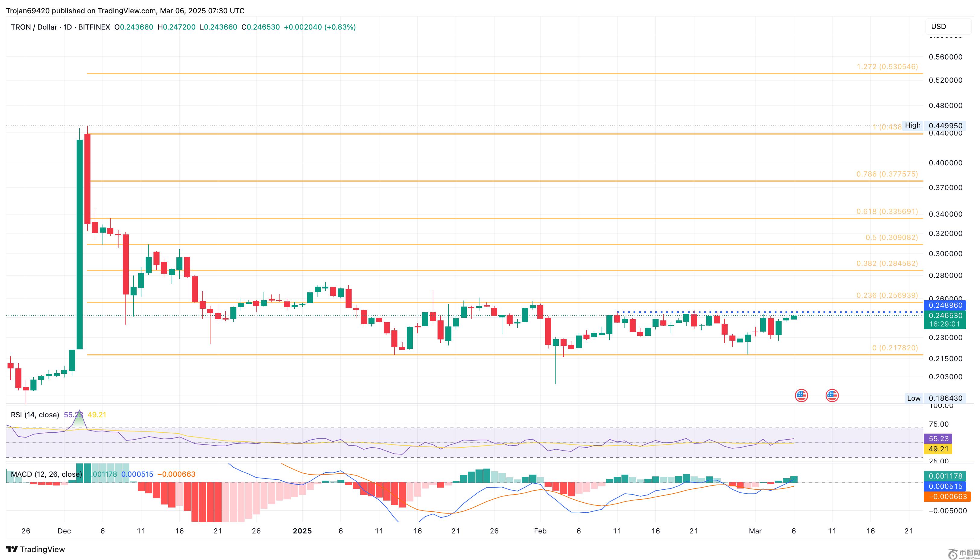 在每日价格图表上,TRX的价格动作显示了一个合并范围,高架天花板在23.60%的斐波那契水平,价格为0.2569美元。
