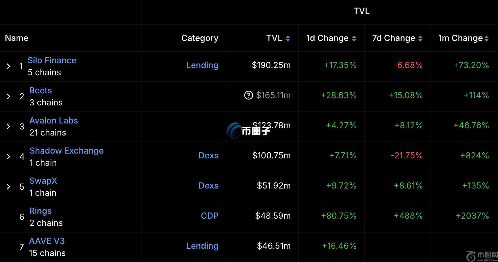 币圈网(Alibtc.com):随着Sonic的影响力逐步扩大,过去一周,多个知名DeFi协议陆续扩展至Sonic,包含以太坊**借贷市场Aave、龙头利率交换市场Pendle、TVL超过27亿美元的Royco Protocol,甚至交易量第二大DEX Fluid也在评估部署可能性,使得Sonic生态持续作为当前的流动性挖矿热点。