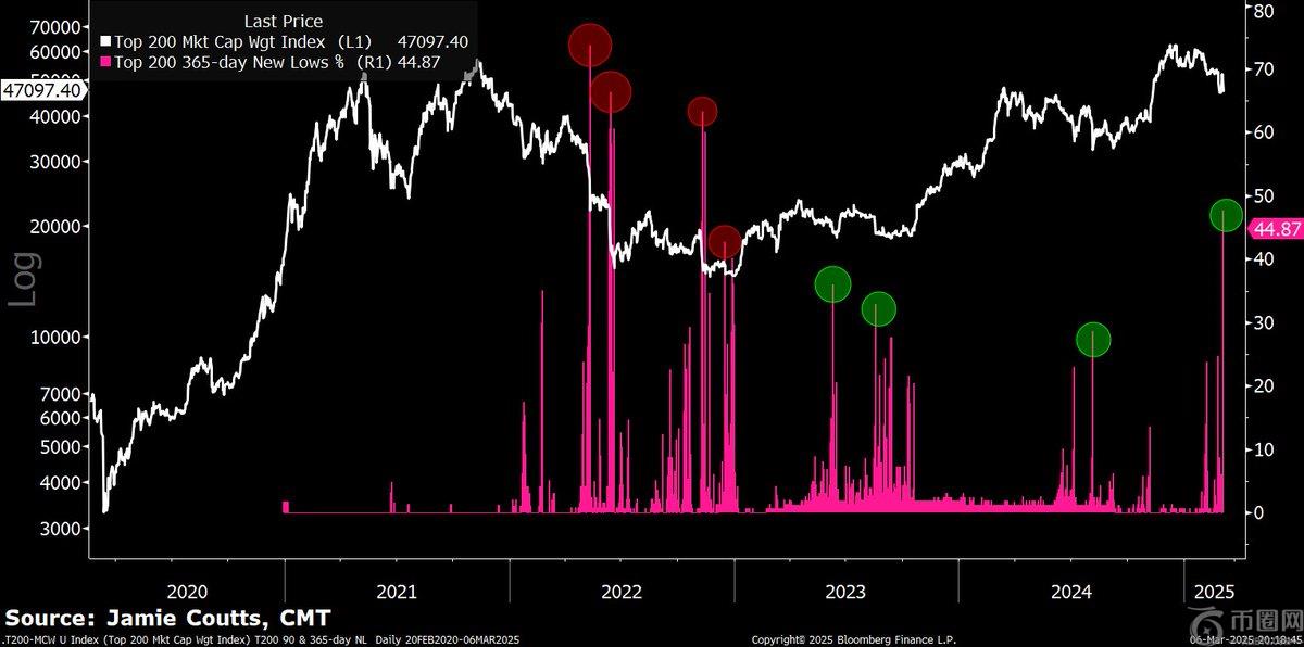 “本周拥有一切。 DXY看到了其第四大阴性为期三天 - 流动性阳性很大。就像比特币一样,在十年内的2月最糟糕。同时,在Altcoin Land中,前200名加密指数又呕吐了一次。图表显示,365天的新低点达到47%,这是公牛周期中投降的标志。到5月,该阶段将使比特币有史以来新的比特币和前200名总股票。”