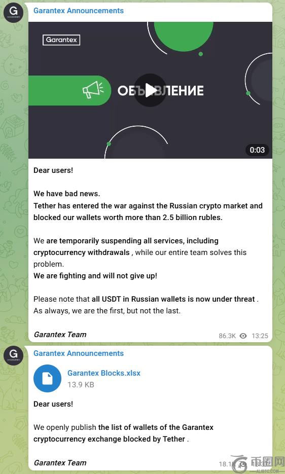 Garantex向其用户发出了警告,并提到“俄罗斯钱包中的所有USDT目前都受到威胁。”交易所进一步表示,它不会放弃并继续战斗。后来,该交易所发布了一份被系带阻塞的钱包清单。