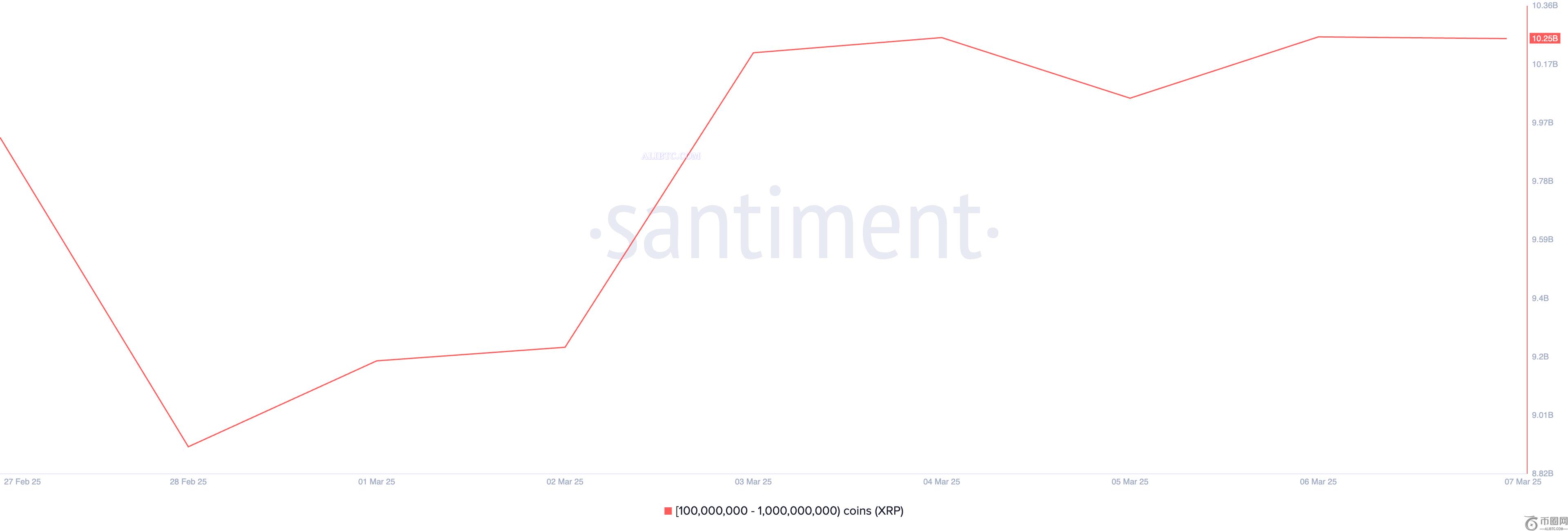 本周,鲸鱼也增加了 XRP 持有量。Santiment 的数据显示,持有 1 亿至 10 亿 XRP 的大型鲸鱼钱包中的**数量激增。