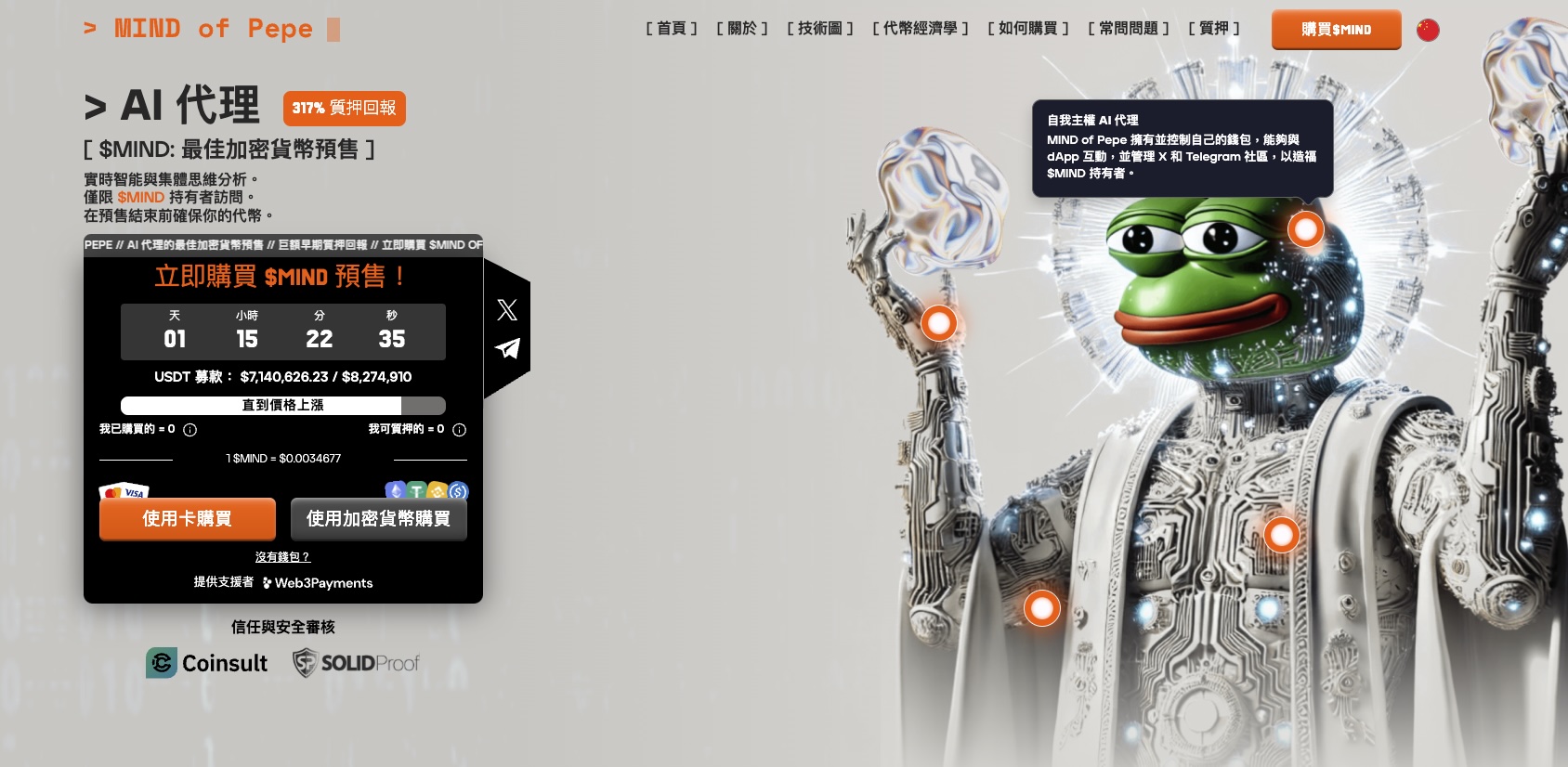 Mind of Pepe ($MIND) 借助 $PEPE 成功(市值高达 72.5 亿美元),为**持有者提供**AI生成交易洞察。该项目引入了自主AI代理——一种能够在**人为干预下独立运作人工智能系统,以实现**数据分析和交易指引。项目至今售出超过700万美元,目前售价为$0.0034955,并在下一阶段上涨。