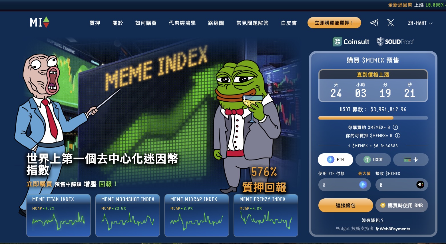 项目目前已售出400万美元,目前价格为$0.0166883,并随每一阶段上涨。此外为了保障投资者安全,Meme Index 已通过 Coinsult 和 SOLIDProof 智慧合约审计,进一步增强了市场信任度。目前,$MEMEX 预售正在火热进行中,投资者可以通过官方网站参与,使用 $USDT、$ETH 或 $BNB 购买**。