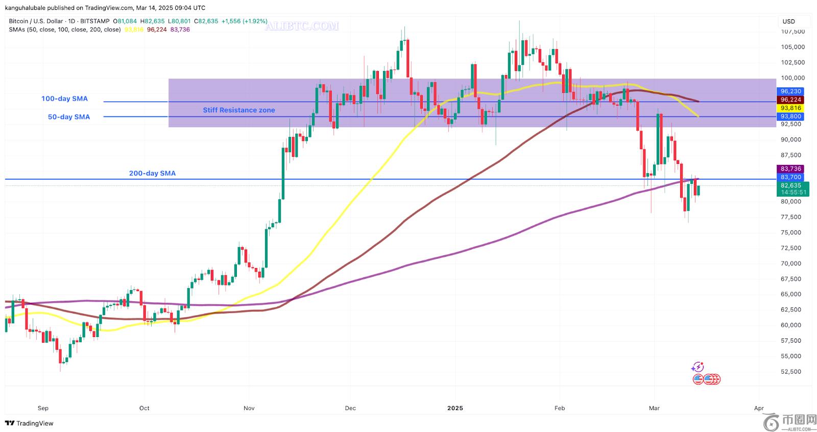 - 3 月 9 日,BTC 跌破 200 天简单移动平均线 (A) 83,736 美元。