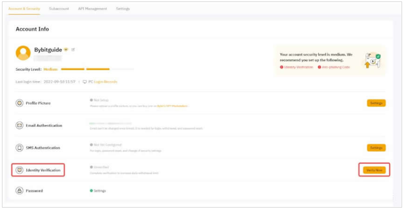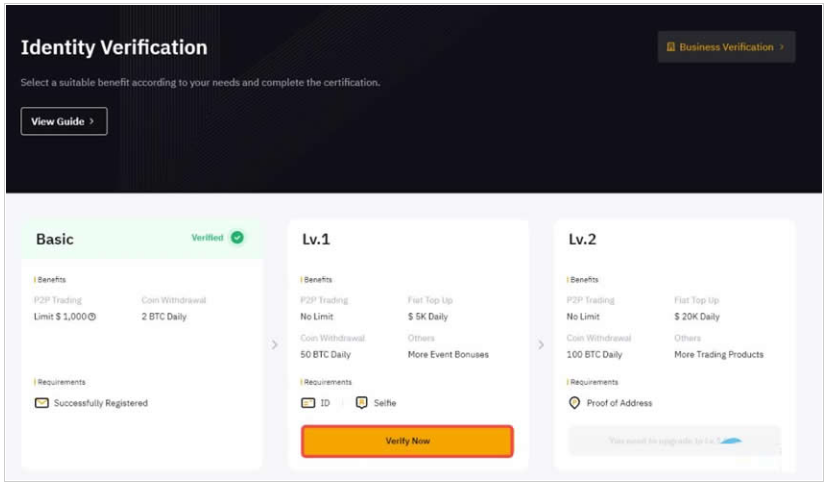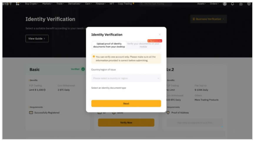 Bybit在大多数功能上都要求用户进行KYC认证,特别是当投资者需要更高的提现限额或使用法币交易功能时。该交易所的KYC认证是一个强制性的身份验证程序,用户需要完成KYC认证才能解锁更多功能,例如更高的提现限额、法币交易和参与活动。但对于新手还不知道Bybit怎么KYC认证?就资料显示,Bybit进行KYC认证还是比较简单的,通常有1级和2级两个选择,具体根据投资者需求选择。下面小编一步一步带您Bybit KYC认证。