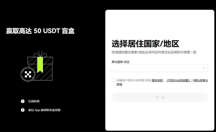 5、选择居住**/地区,勾选服务条款、《风险与合规披露》及隐私政策与声明