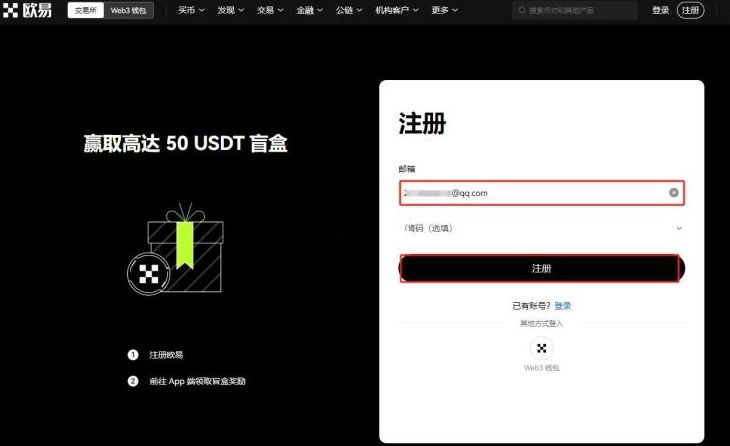 1、打开欧易OKX交易所官网(点击注册),在首页输入邮箱,点击“注册”