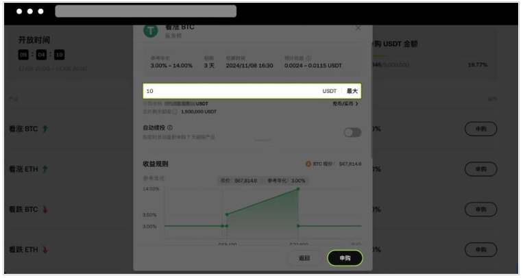12、在剩余配额中是您想要的USDT金额,点击申购完成订单。